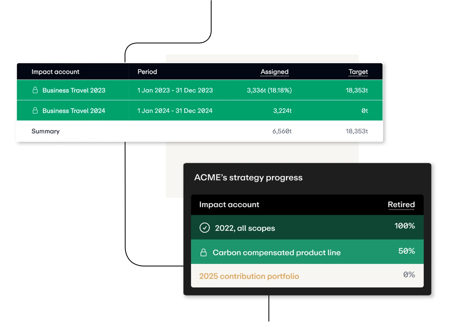 Organise your credits by emission scope, product line, or financial period. Track progress of individual assets or organisation-wide targets all the way to retirement across registries.